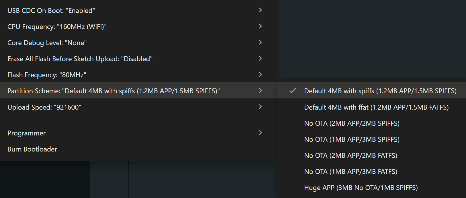 partitions*.csv)中可以看到,預設配置約為 1.2MB 的 APP(應用程式)空間,以及 1.5MB 的 SPIFFS 空間。1.2MB + 1.5MB = 2.7MB,其餘空間則由系統使用,例如 NVS(Non-Volatile Storage)、OTA(Over-The-Air)更新區等。如果 Flash 容量不足,也可以額外擴充 SD 卡模組。實際可用空間大小取決於 SD 卡容量,並可依需求格式化為 FAT、SPIFFS、LittleFS 等檔案系統格式。