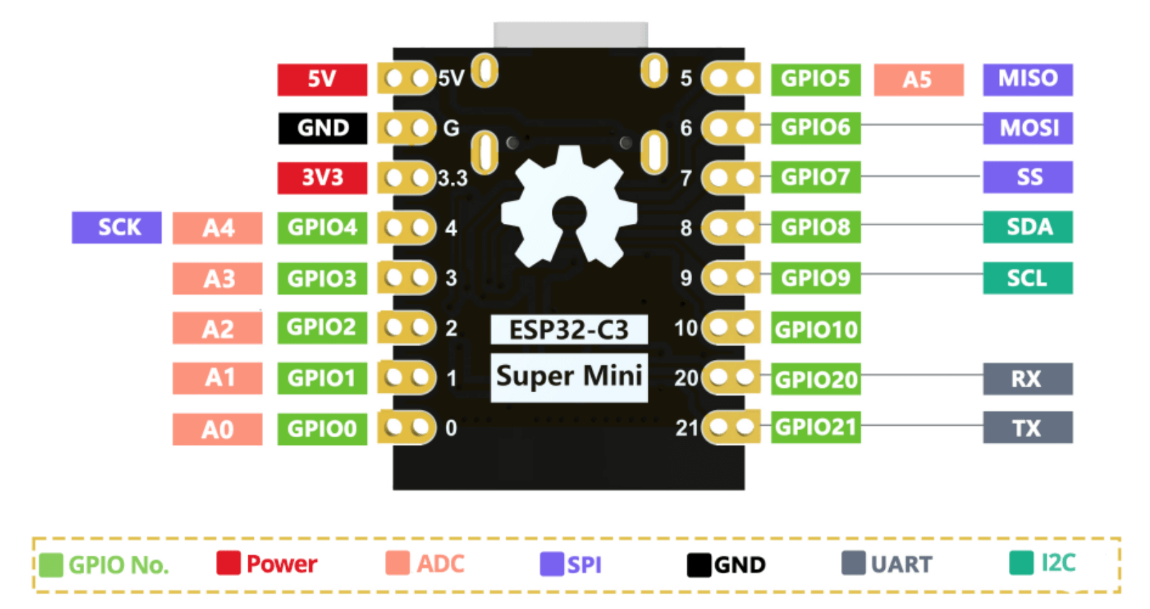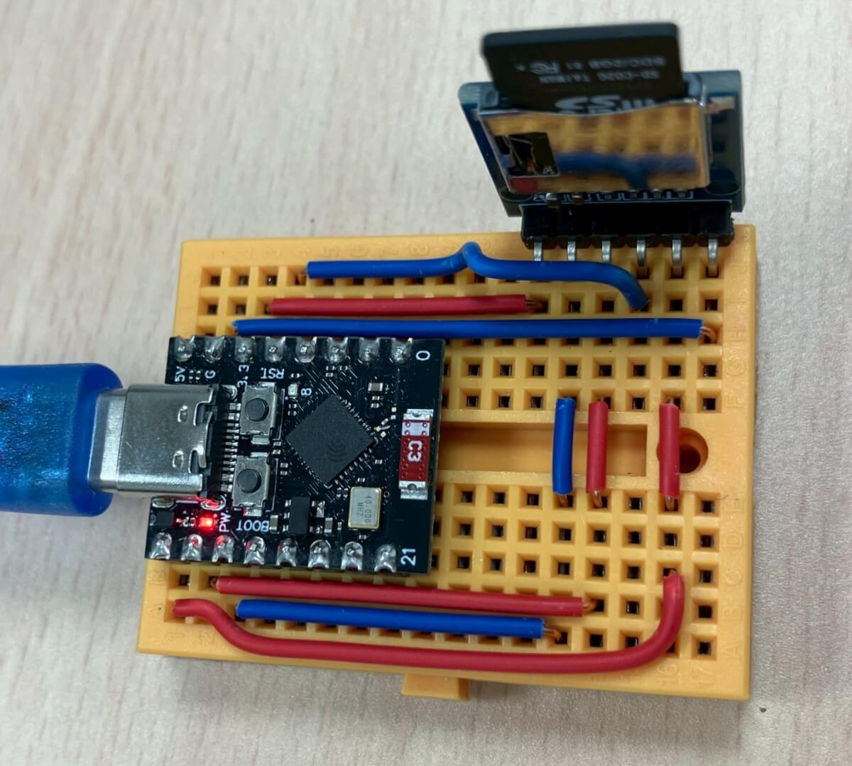 使用 ESP32-C3 預設接腳,會用到 GPIO 4(SCK)、5(MISO)、6(MOSI)、7(SS) 及 3.3V、GND 六支接腳。